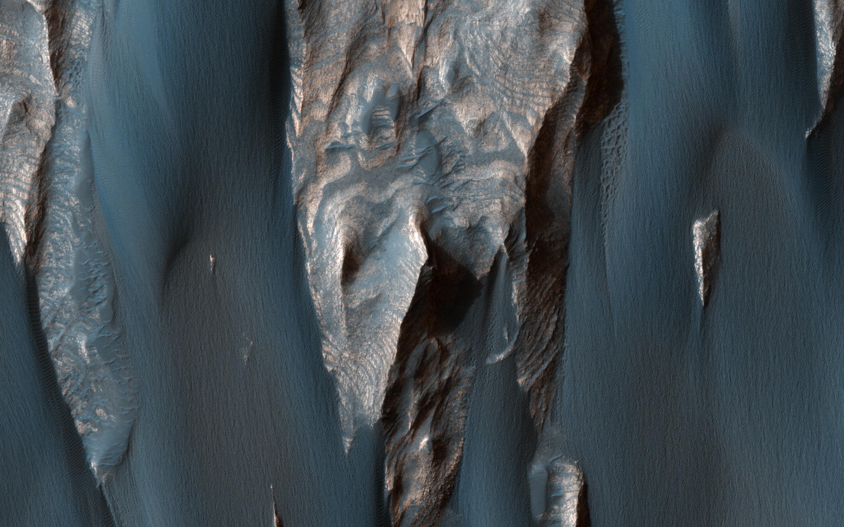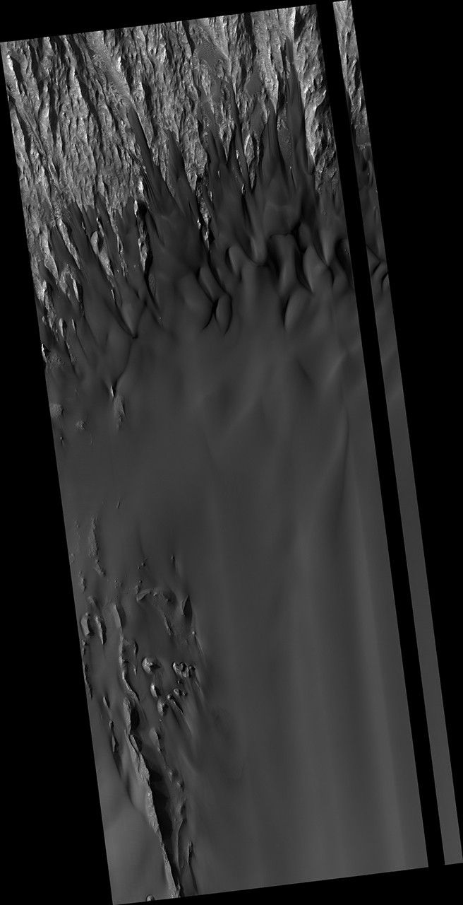 Dark, windblown sand covers intricate sedimentary rock layers in this image captured by NASA's Mars Reconnaissance Orbiter (MRO) from Ganges Chasma, a canyon in the Valles Marineris system.