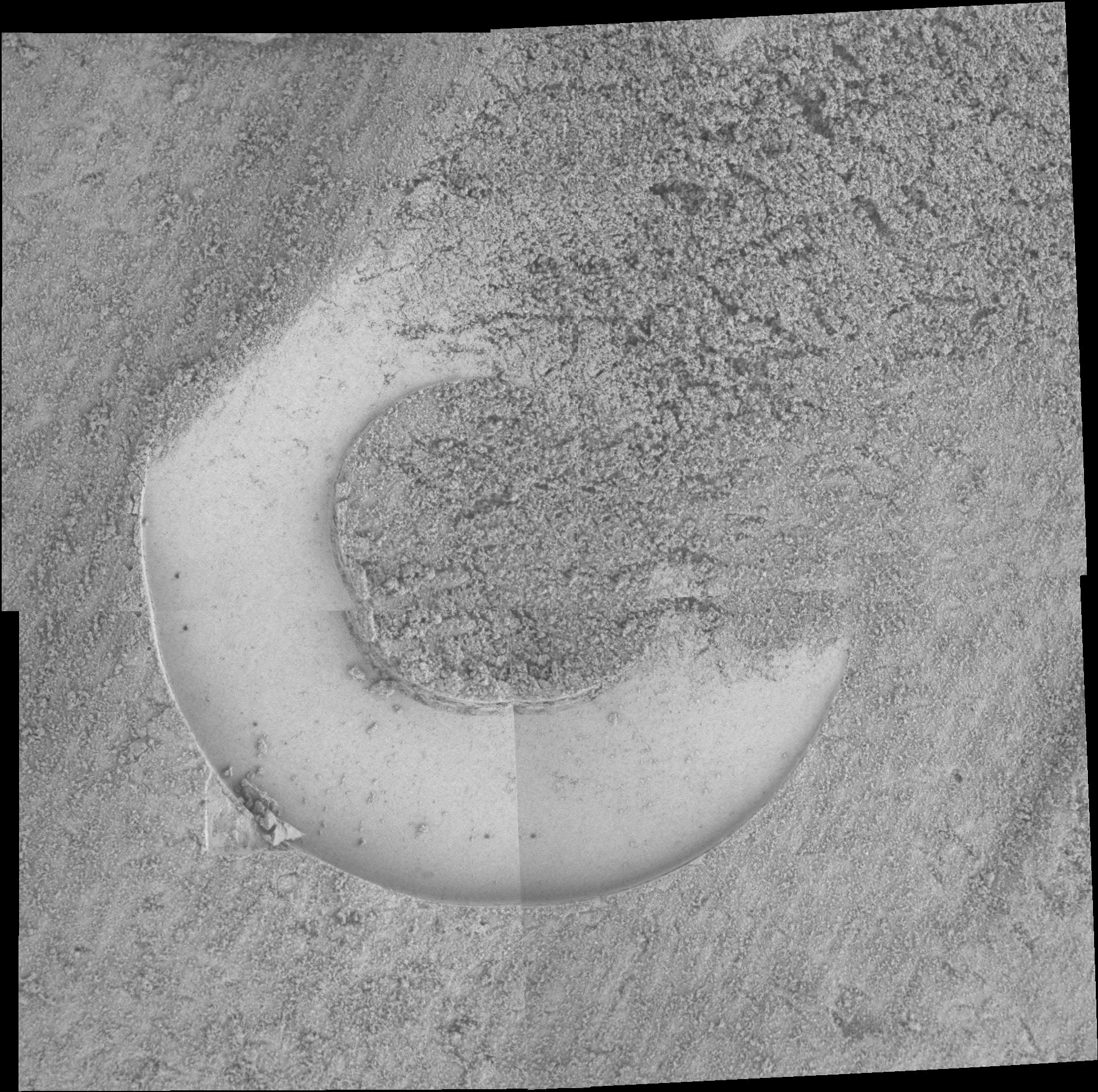 The ability of the soil to make fine molds of the faceplate suggests the material is a mix of sand and dust. The dust is pushed into the pores of the sand and keeps the material from collapsing. This allows for very detailed impressions of the faceplate.