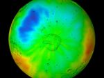 Observations by NASA's 2001 Mars Odyssey spacecraft show a wintertime view of the north polar region of Mars in intermediate-energy, or epithermal, neutrons. The map is based on data acquired by the high-energy neutron detector, one of the instruments in Odyssey's gamma-ray spectrometer suite. Soil enriched by hydrogen is indicated by the purple and deep blue colors on the map, which show a low intensity of epithermal neutrons. Progressively smaller amounts of hydrogen are shown in the colors light blue, green, yellow and red. The hydrogen is believed to be in the form of water ice. Much of the hydrogen is hidden at this time beneath a layer of carbon dioxide frost (dry ice). A shaded-relief rendition of topography is superimposed on this map for geographic reference.