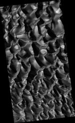 Dunes with Proctor Crater on Mars are seen in this newly released HiRISE image. Proctor is located in the southern hemisphere where it is winter at the time this image was taken. The HiRISE image documents new seasonal processes occurring on dunes at this latitude, as well as other interesting phenomena. The bright tones are interpreted as CO2 or H2O frost. This is generally concentrated on the east-facing slopes of the dunes, which are in shadow and therefore cooler. Some dark spots on the dunes may be areas that have defrosted more than surrounding terrain. Landslides and dark-toned streaks are seen on many of the west-facing dune slopes. The general dune morphology indicates formation by westerly winds. However, zooming in on the image shows smaller scale ripples that appear to have been formed by winds blowing from the south and north.
