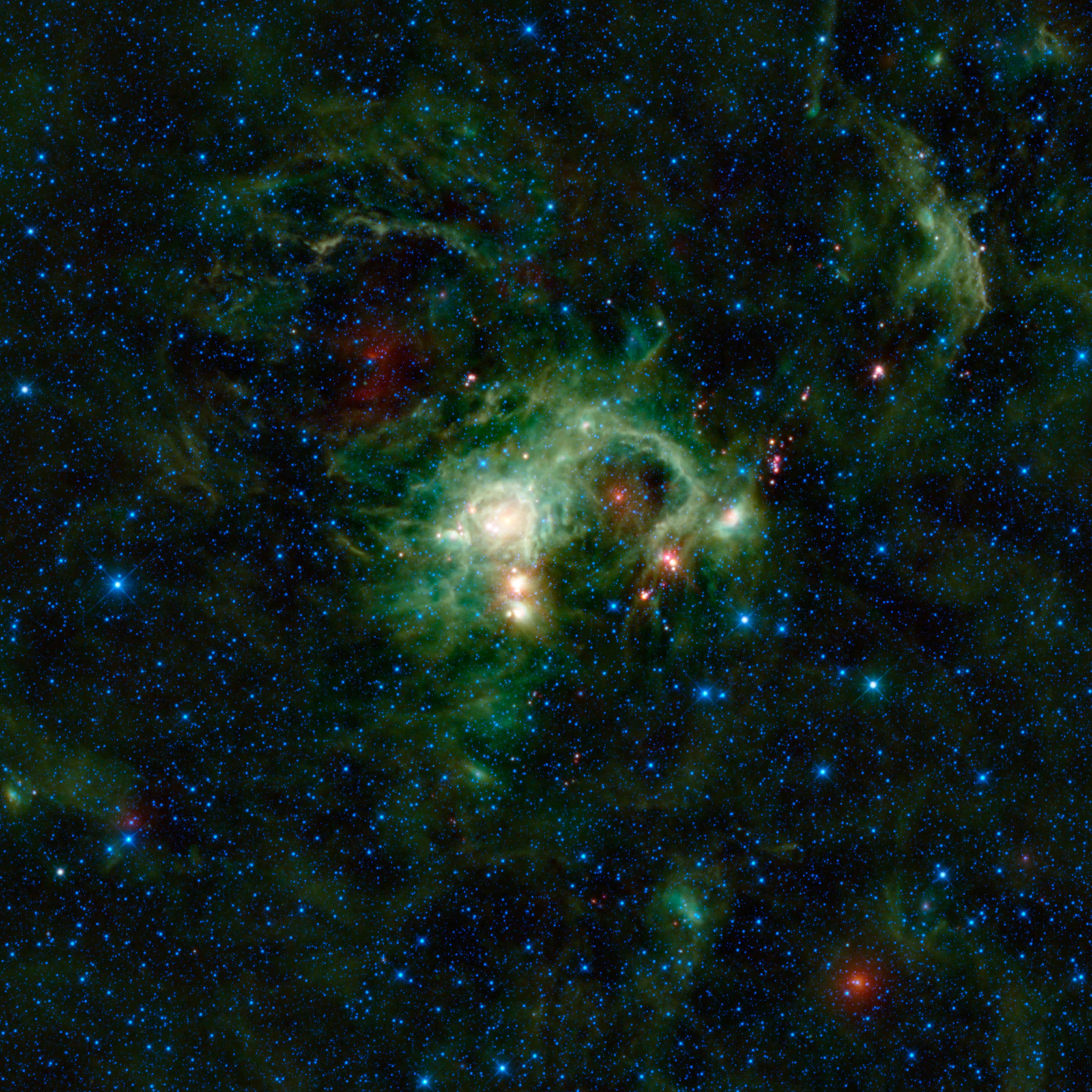 Another mysterious object seen in this image is IRAS 05338+3447, the bright red object in the lower right corner. This object was seen by the Infrared Astronomical Satellite, or IRAS, as an indistinct bright spot. The WISE image shows the object much more clearly, but does not immediately reveal if it is associated with the larger star-forming region. There are also several red-colored stars in this image, which are likely young stellar objects. These are baby stars wrapped up in blankets of dust that glow brightly in infrared light