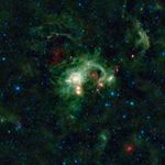 Color in this image represents specific wavelengths of infrared light. Blue and cyan (blue-green) represent 3.4- and 4.6-micron wavelengths, which is primarily light emitted from hot stars. Green and red represent 12- and 22-micron wavelengths, which is mostly light from warm dust.