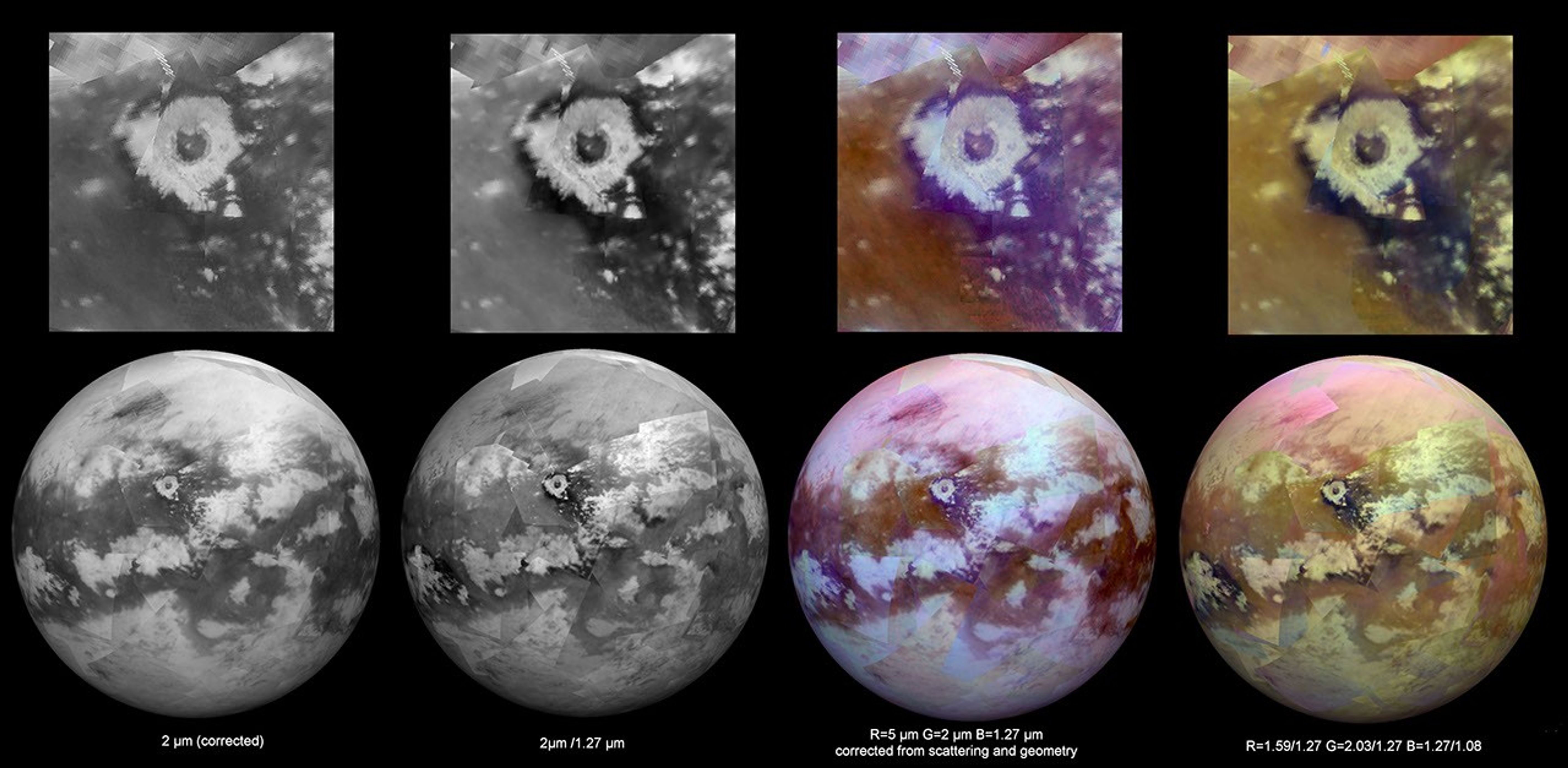 In each montage, the images from left to right present different views that demonstrate the broad spectral capability of the VIMS instrument. The upper row of images in each montage shows a particular region of interest; one features the 50-mile-wide (80-kilometer-wide) Sinlap impact crater, while the other focuses on the region surrounding the landing site for ESA's Huygens probe. The lower row of images features maps of the hemispheres in which these regions are located.