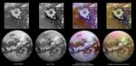 The final (rightmost) views are color composites created using ratios that divide the brightness of the surface in one set (or band) of wavelengths by that of another set in order to produce the red, green and blue channels of a color composite image. Like spectral ratio images, these images may reveal differences in the nature of surface materials.