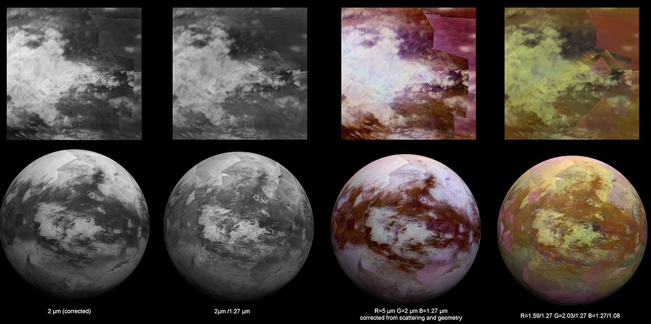 Each of these two montages shows four synthetic views of Titan created using data acquired by the visual and infrared mapping spectrometer (VIMS) on board NASA's Cassini spacecraft between 2004 and 2015. These views demonstrate some of the progress researchers have made in creating smooth-looking maps of Titan from the multitude of different VIMS observations made under a wide variety of lighting and viewing conditions.