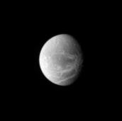 Lit terrain seen here is on the Saturn-facing side of Dione (1,126 kilometers, or 700 miles across). North on Dione is up and rotated 18 degrees to the right.