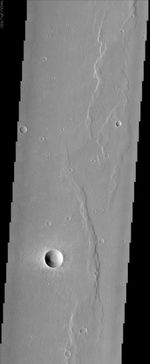 Wrinkle ridges are a very common landform on Mars, Mercury, Venus, and the Moon. These ridges are linear to arcuate asymmetric topographic highs commonly found on smooth plains. The origin of wrinkle ridges is not certain and two leading hypotheses have been put forth by scientists over the past 40 years. The volcanic model calls for the extrusion of high viscosity lavas along linear conduits. This thick lava accumulated over these conduits and formed the ridges. The other model is tectonic and advocates that the ridges are formed by compressional faulting and folding. Today's THEMIS image is of the ridged plains of Lunae Planum located between Kasei Valles and Valles Marineris in the northern hemisphere of the planet. Wrinkle ridges are found mostly along the eastern side of the image. The broadest wrinkle ridges in this image are up to 2 km wide. A 3 km diameter young fresh crater is located near the bottom of the image. The crater's ejecta blanket is also clearly seen surrounding the sharp well-defined crater rim. These features are indicative of a very young crater that has not been subjected to erosional processes.