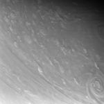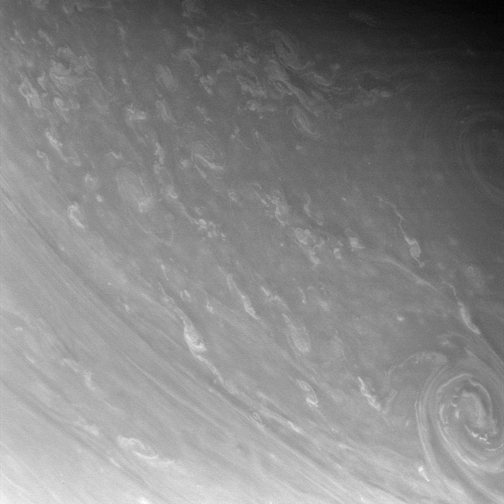 Contorted clouds wriggle across high northern latitudes in this exquisitely detailed close-up of Saturn's atmosphere. Two immense storms swirl at right, each easily 2,000 kilometers (1,200 miles) across.