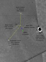 This map of the Mars Exploration Rover Opportunity's new neighborhood at Meridiani Planum, Mars, shows the surface features used to locate the rover. By imaging these "bumps" on the horizon from the perspective of the rover, mission members were able to pin down the rover's precise location. The image consists of data from the Mars Global Surveyor orbiter, the Mars Odyssey orbiter and the descent image motion estimation system located on the bottom of the rover.