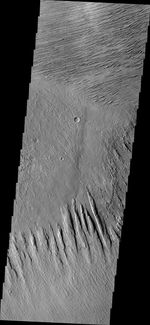 The linear features in this VIS image are called yardangs. Yardangs are formed when winds erode poorly cemented materials, like those that form Zephyria Planum.