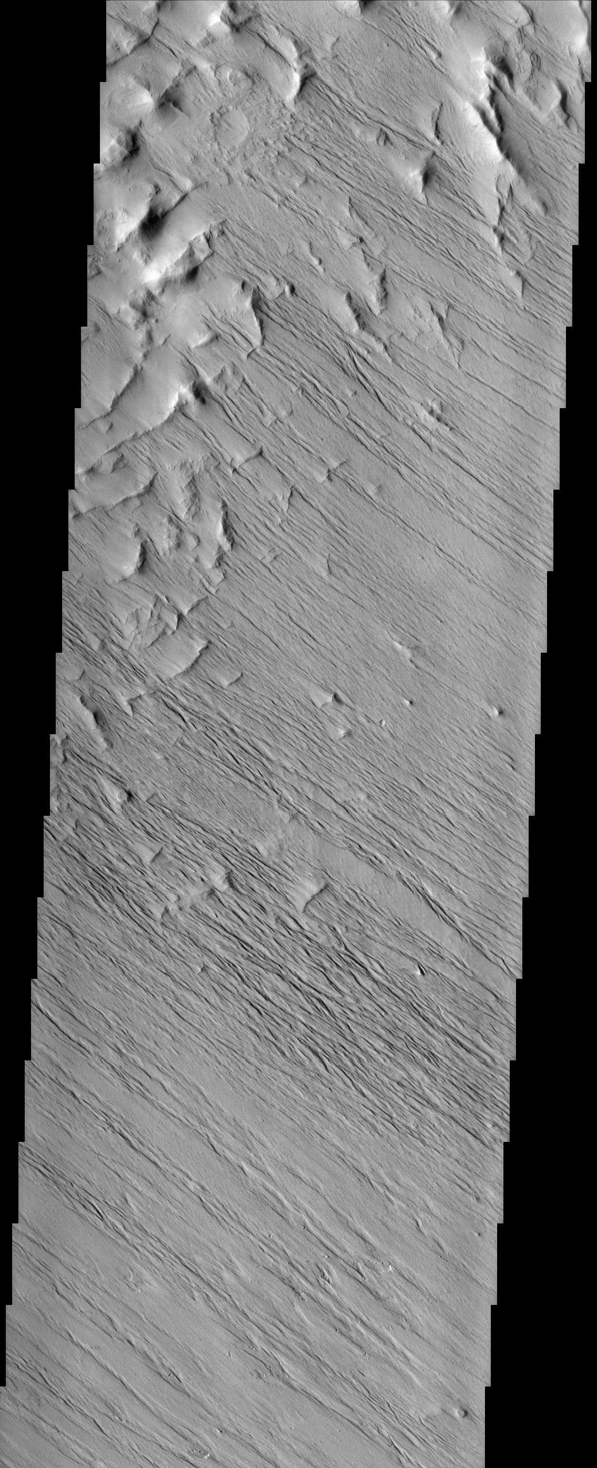 In this region of the Olympus Mons aureole, located to the southwest of the volcano, the surface has been eroded by the wind into linear landforms called yardangs, which can be seen in this image from NASA's Mars Odyssey spacecraft.