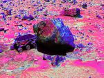Sojourner has made contact with the rock "Yogi" in this false-color image, taken with the Imager for Mars Pathfinder (IMP). The rover's left rear wheel has driven up onto the Yogi's surface in an attempt to get as close as possible to the rock's surface. Sojourner will later use its Alpha Proton X-Ray Spectrometer (APXS) instrument to conduct a study of Yogi's chemical composition.