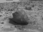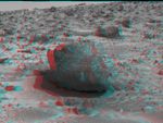 "Yogi," a rock taller than rover Sojourner, is the subject of this image, taken in stereo by the deployed Imager for Mars Pathfinder (IMP) on Sol 3. 3D glasses are necessary to identify surface detail. The soil in the foreground has been the location of multiple soil mechanics experiments performed by Sojourner's cleated wheels. Pathfinder scientists were able to control the force inflicted on the soil beneath the rover's wheels, giving them insight into the soil's mechanical properties. The soil mechanics experiments were conducted after this image was taken.
