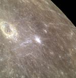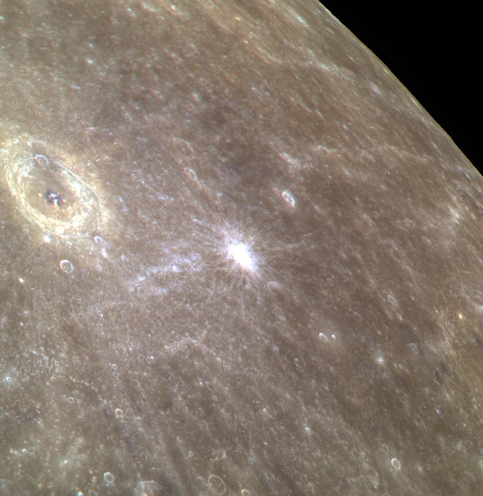 This stunning color image shows the complex crater Bartok as well as the limb of Mercury. The white spot to the right of Bartok in this image is the site of a young, rayed crater approximately 11 km (7 miles) in diameter. North is to the bottom left in this image.