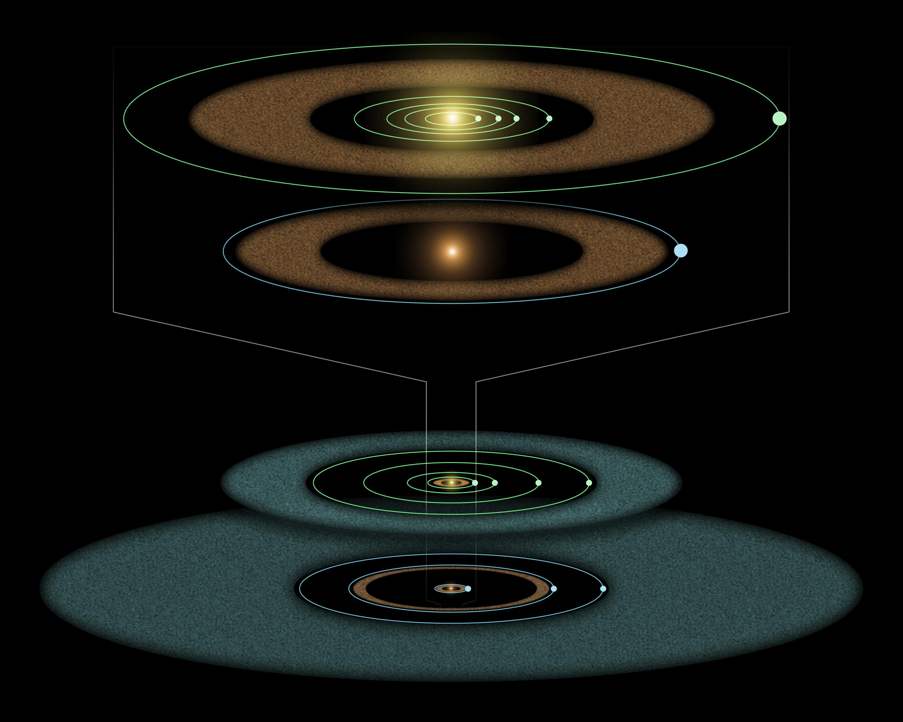 This artist's diagram compares the Epsilon Eridani system to our own solar system. The two systems are structured similarly, and both host asteroids (brown), comets (blue) and planets (white dots).