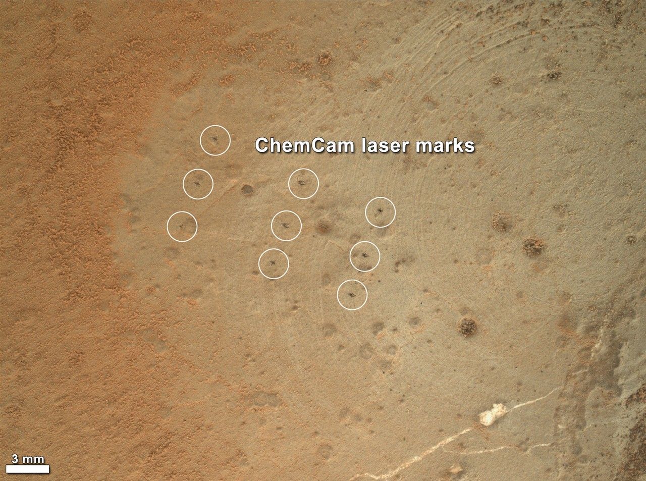 The image shows nine small pits created by the rover's Chemistry and Camera (ChemCam) laser during its analysis of the target, one of four potential drill targets considered. Ultimately, this site was not chosen for the rover's first drilling. The rest of the features are natural to the rock, and include fractures, white veins, gray and white nodules, pits and tiny dark grains. Remaining clumps and specks of dust can also be seen. The scale bar at lower left is 0.12 inches (3 millimeters).