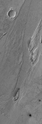 This Mars Global Surveyor (MGS) Mars Orbiter Camera (MOC) image shows streamlined islands and a small cataract in an outflow channel system in the Zephyria region of Mars, south of Cerberus. The fluids responsible for creating these landforms flowed from the lower left (southwest) toward upper right (northeast). The fluids may have been water and mud or, some Mars scientists have argued, extremely fluid lava. The presence of a small cataract probably argues more strongly for a water and mud origin. This image is located near 3.8°N, 204.7°W. The picture covers an area about 3 km (1.9 mi) wide and is illuminated by sunlight from upper left.