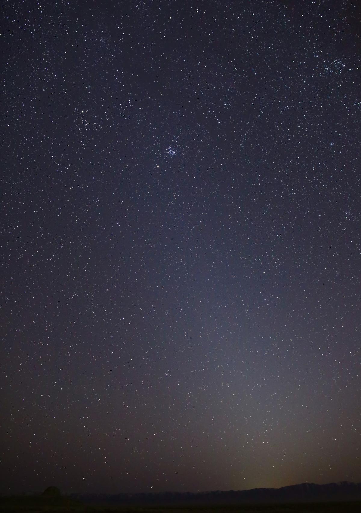 This photo shows the zodiacal light as it appeared on March 1, 2021, in Skull Valley, Utah. The Pleiades star cluster is visible near the top of the light column. Mars is just below that.