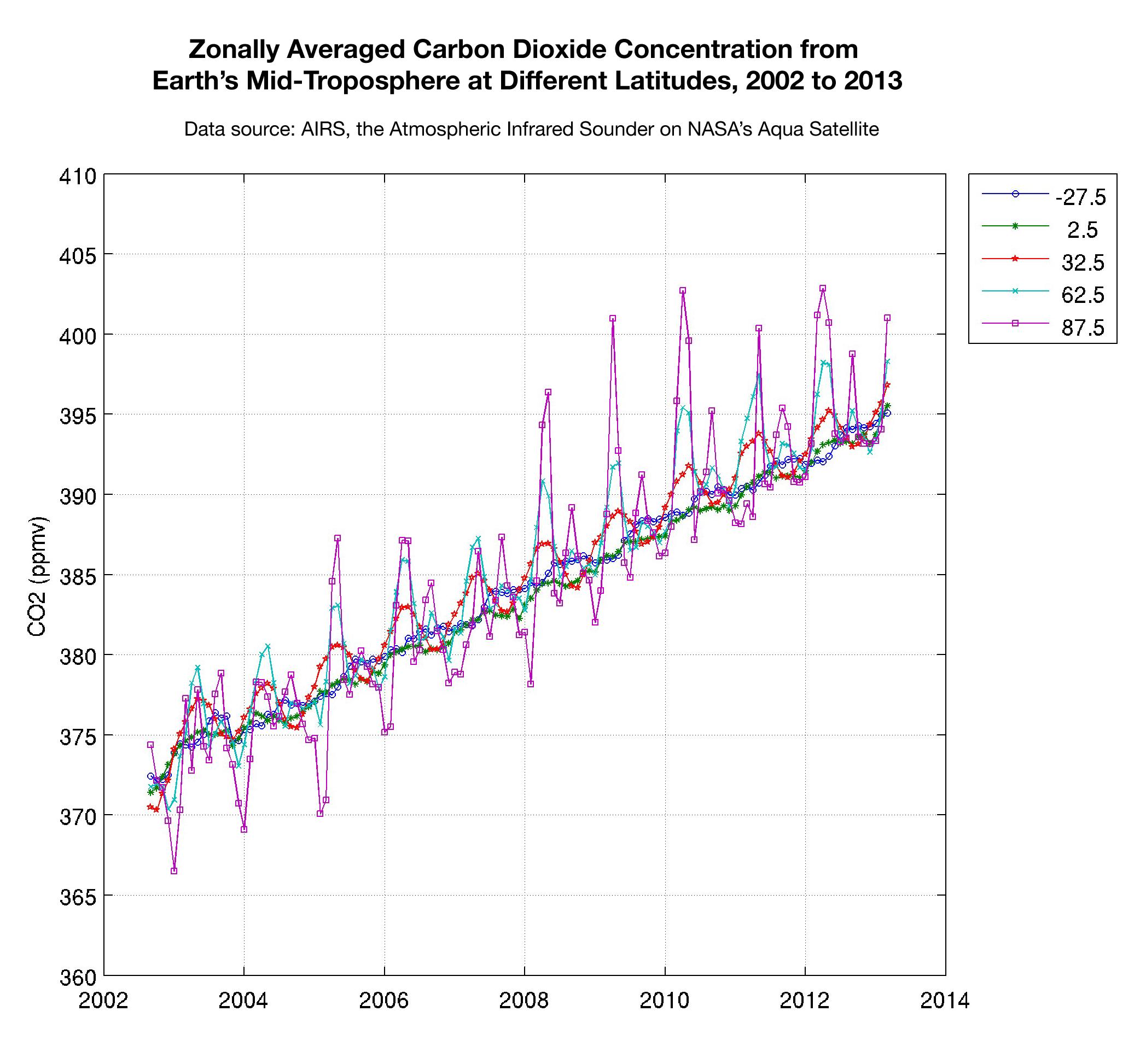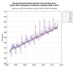 This plot shows the concentration of carbon dioxide in Earth's mid-troposphere at various latitudes as measured by the Atmospheric Infrared Sounder (AIRS) instrument on NASA's Aqua satellite. The colored lines represent different latitude bands that circle Earth, called "zones." The central latitude for each zone is given in the legend.