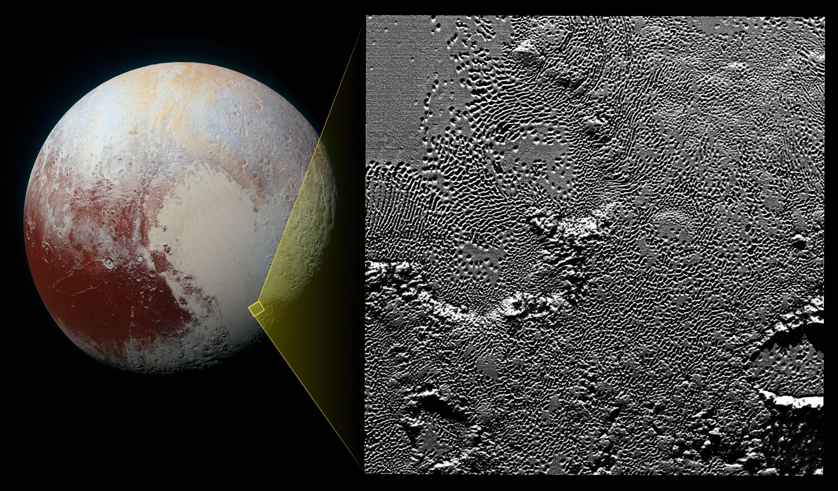 The image is part of a sequence taken by New Horizons' Long Range Reconnaissance Imager (LORRI) as the spacecraft passed within 9,550 miles (15,400 kilometers) of Pluto's surface, just 13 minutes before the time of closest approach. The small box on the global view shows the section of the region imaged in the southeast corner of the giant ice sheet informally named Sputnik Planum. The magnified view is 50-by-50 miles (80-by-80 kilometers) across. The large ring-like structure near the bottom right of the magnified view -- and the smaller one near the bottom left -- may be remnant craters. The upper-left quadrant of the image shows the border between the relatively smooth Sputnik Planum ice sheet and the pitted area, with a series of hills forming slightly inside this unusual "shoreline."