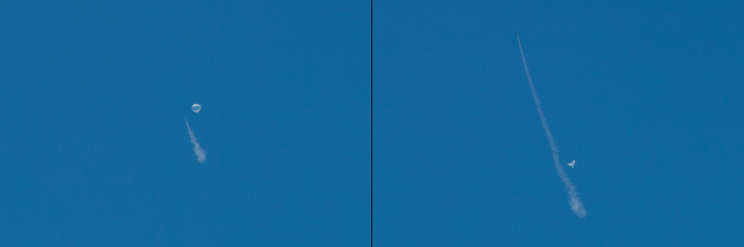 The plume left by the test vehicle's main engine can be seen in these images. Engineers arranged for the balloon to deflate and descend shortly after the rocket fired.