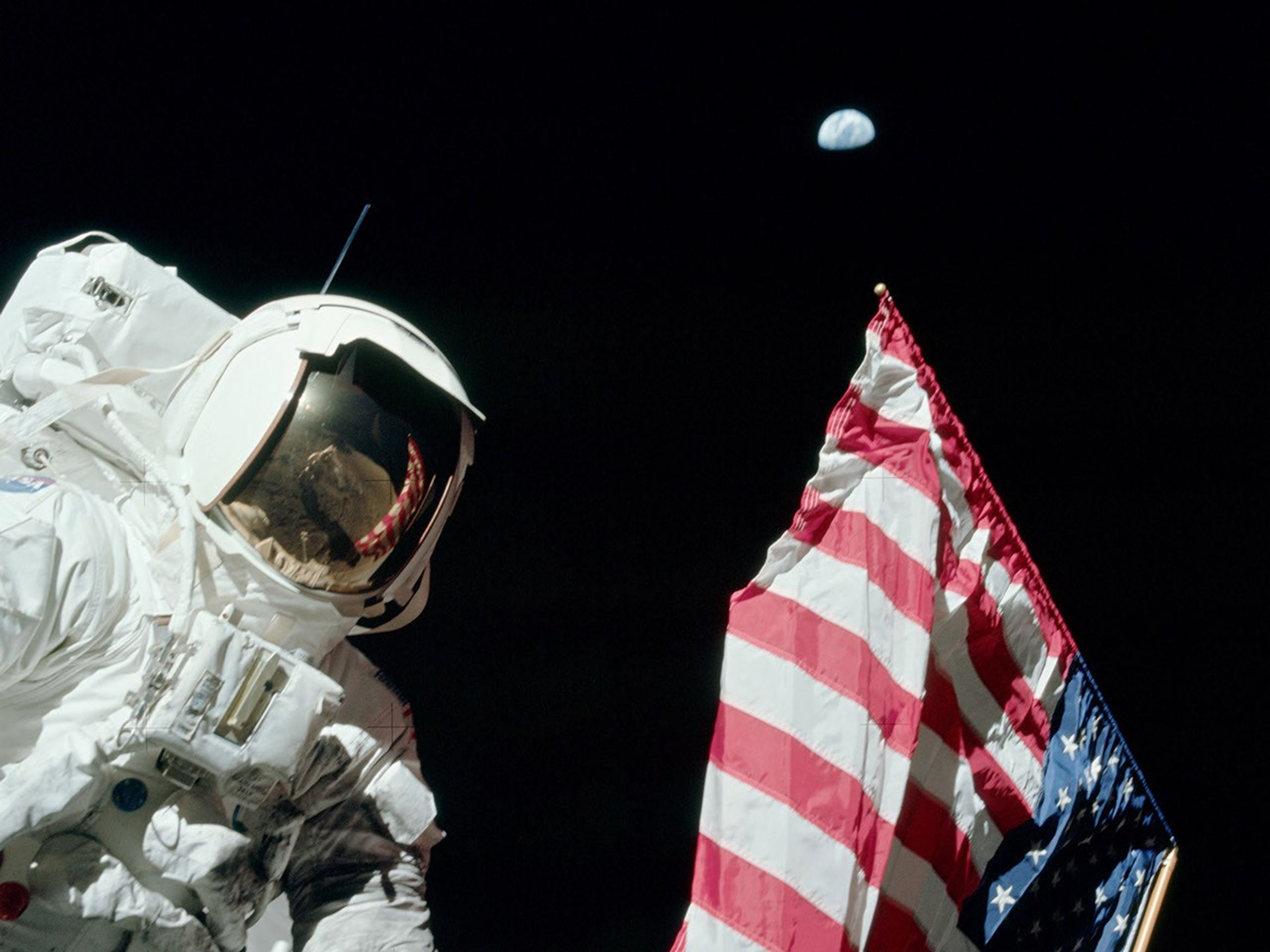 Apollo 17 astronaut Jack Schmitt with the U.S. flag and the Earth in the sky. Taken during the mission's first EVA on the lunar surface on December 19, 1972.