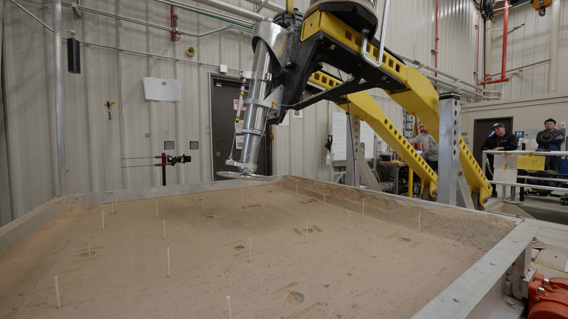 This setup is being used at NASA’s Jet Propulsion Laboratory to test a 16-inch-diameter (40-centimeter-diameter) footpad for a future Mars lander. The footpad was plunged into a test bed filled with 10,000 pounds (4,536 kilograms) of simulated Martian soil in order to see how deep it would sink – too far, and the lander’s belly could scrape against the ground during touchdown, damaging it.