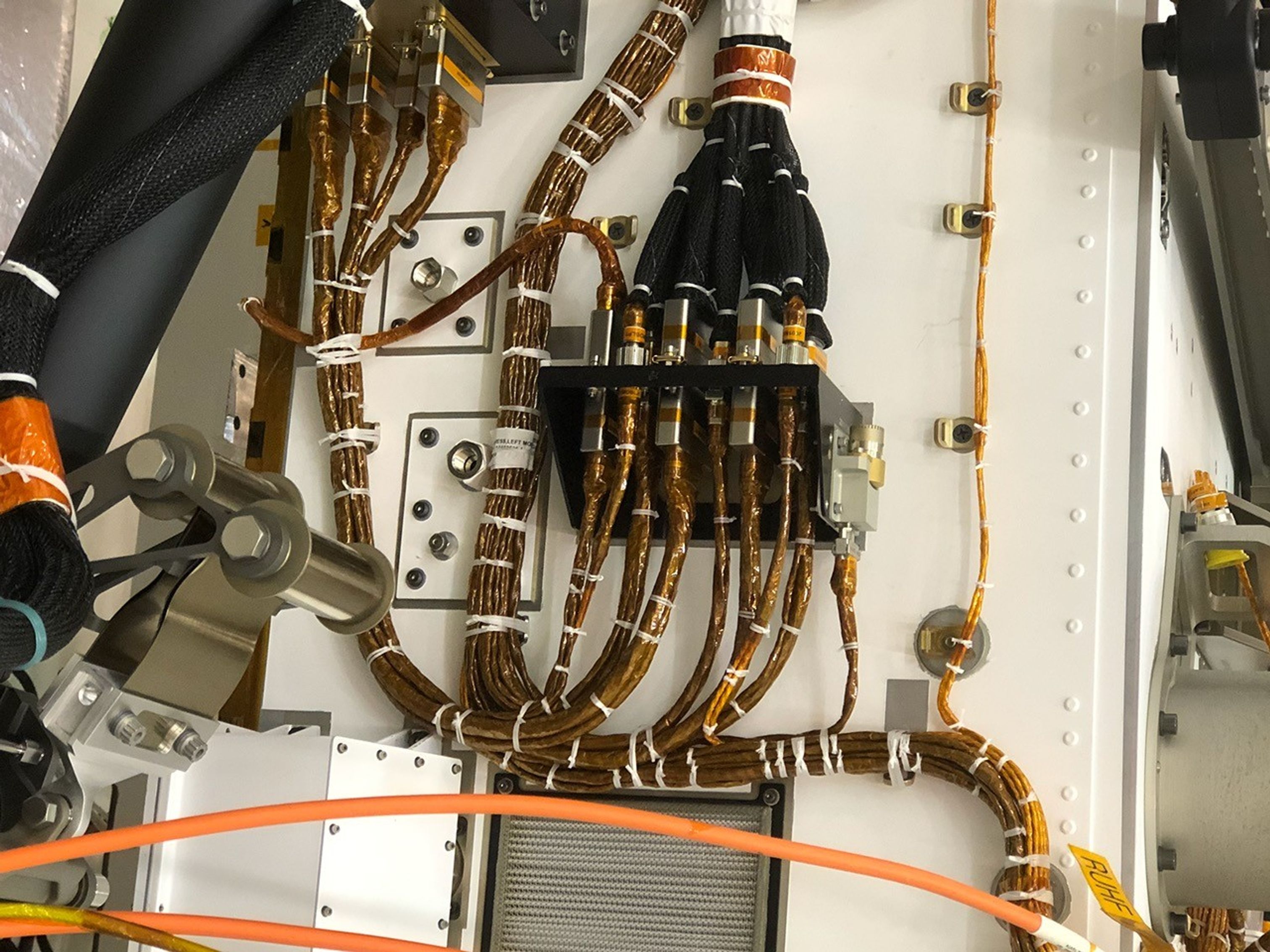 Components are visible on the port side of the Perseverance rover in this close-up image taken on Nov. 16, 2019, in High Bay 1 of the Spacecraft Assembly Facility at NASA's Jet Propulsion Laboratory in Southern California. At center of the image, attached to the side of the rover, is a black cable bracket (with gold cabling running through it). Attached to the top of this black bracket – and gray in color – is the Entry Descent and Landing (EDL) microphone. Below the cable bracket are the Mars Oxygen In-Situ Resource Utilization Experiment (MOXIE) wall ports. The orange cable passing over it is part of ground support equipment.