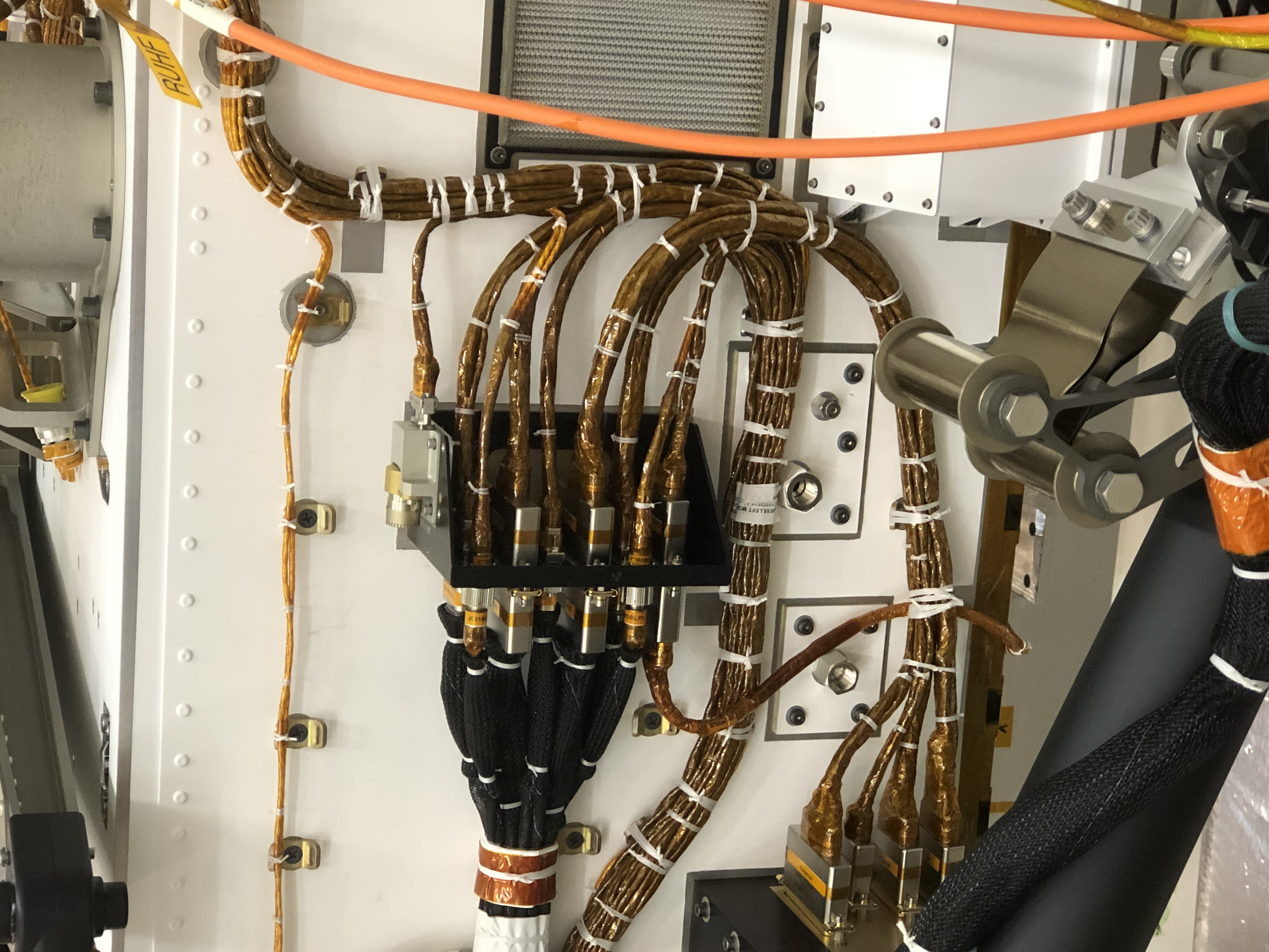 Components are visible on the port side of the Perseverance rover in this close-up image taken on Nov. 16, 2019, in High Bay 1 of the Spacecraft Assembly Facility at NASA's Jet Propulsion Laboratory in Southern California. At center of the image, attached to the side of the rover, is a black cable bracket (with gold cabling running through it). Attached to the top of this black bracket – and gray in color – is the Entry Descent and Landing (EDL) microphone. Below the cable bracket are the Mars Oxygen In-Situ Resource Utilization Experiment (MOXIE) wall ports. The orange cable passing over it is part of ground support equipment.