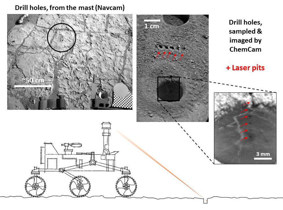 NASA's Curiosity Mars rover targeted the laser of the Chemistry and Camera (ChemCam) instrument with remarkable accuracy for assessing the composition of the wall of a drilled hole and tailings that resulted from the drilling. This graphic diagrams the pointing and shows the resulting pits created by the laser shots.