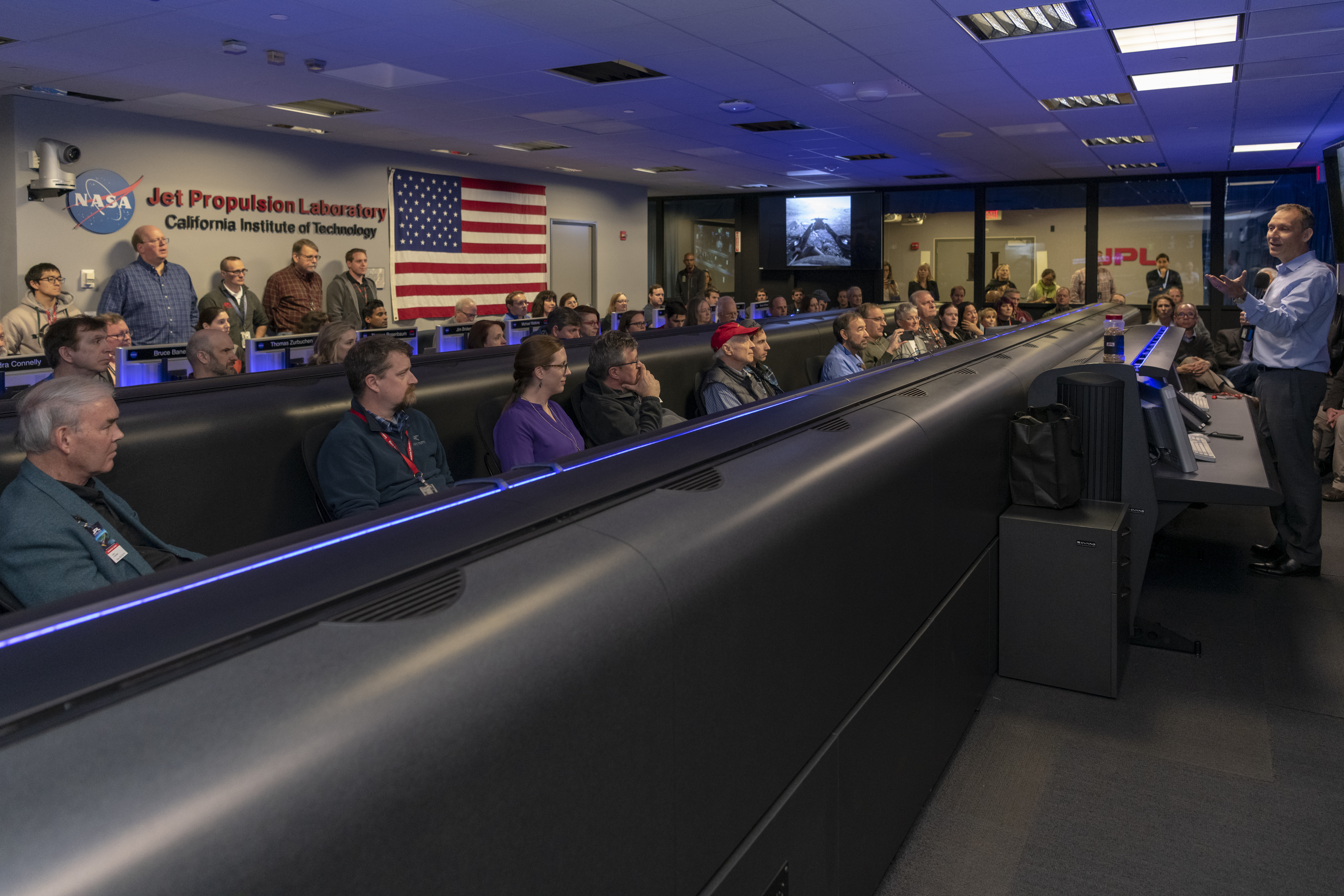 NASA Associate Administrator for Science Thomas Zurbuchen addressed the Opportunity rover team inside Mission Control at NASA’s Jet Propulsion Laboratory in Pasadena, California, a few hours before the team made its last attempts to listen for the rover’s signal from Mars. The image was taken on Feb. 12, 2019.
