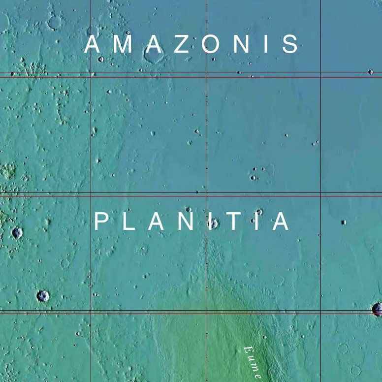 This is a topographic map of Amazonis Planitia, one of the smoothest plains on Mars. Data to create this image were taken with the Mars Global Surveyor, Mars Orbiter Laser Altimeter (MOLA) instrument. Color indicate elevation, with red highest, yellow intermediate, and green/blue lowest.