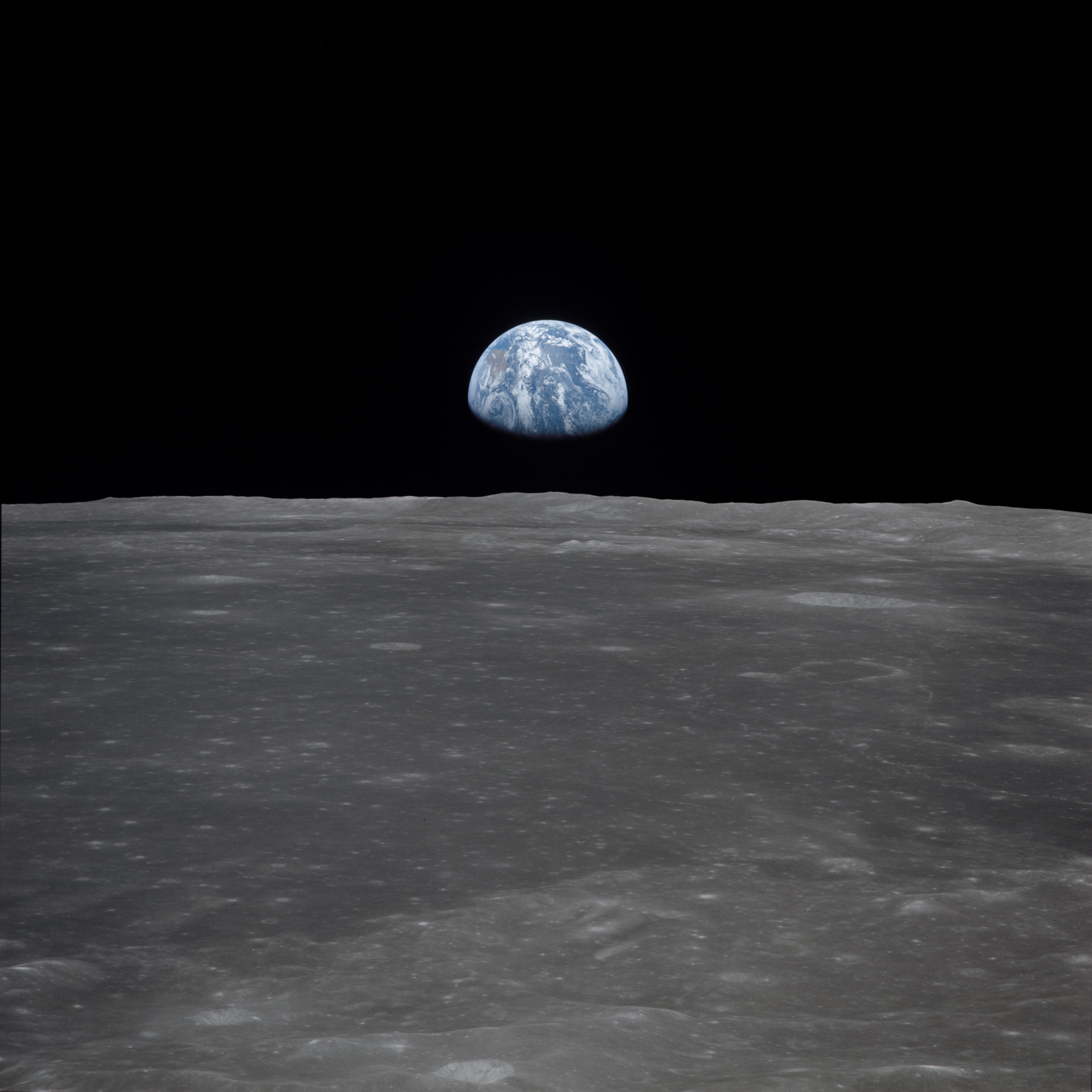This view from the Apollo 11 spacecraft shows the Earth rising above the moon's horizon. The lunar terrain pictured is in the area of Smyth's Sea on the nearside. Coordinates of the center of the terrain are 85 degrees east longitude and 3 degrees north latitude. While astronauts Neil A. Armstrong, commander, and Edwin E. Aldrin Jr., lunar module pilot, descended in the Lunar Module (LM) "Eagle" to explore the Sea of Tranquility region of the moon, astronaut Michael Collins, command module pilot, remained with the Command and Service Modules (CSM) "Columbia" in lunar orbit.