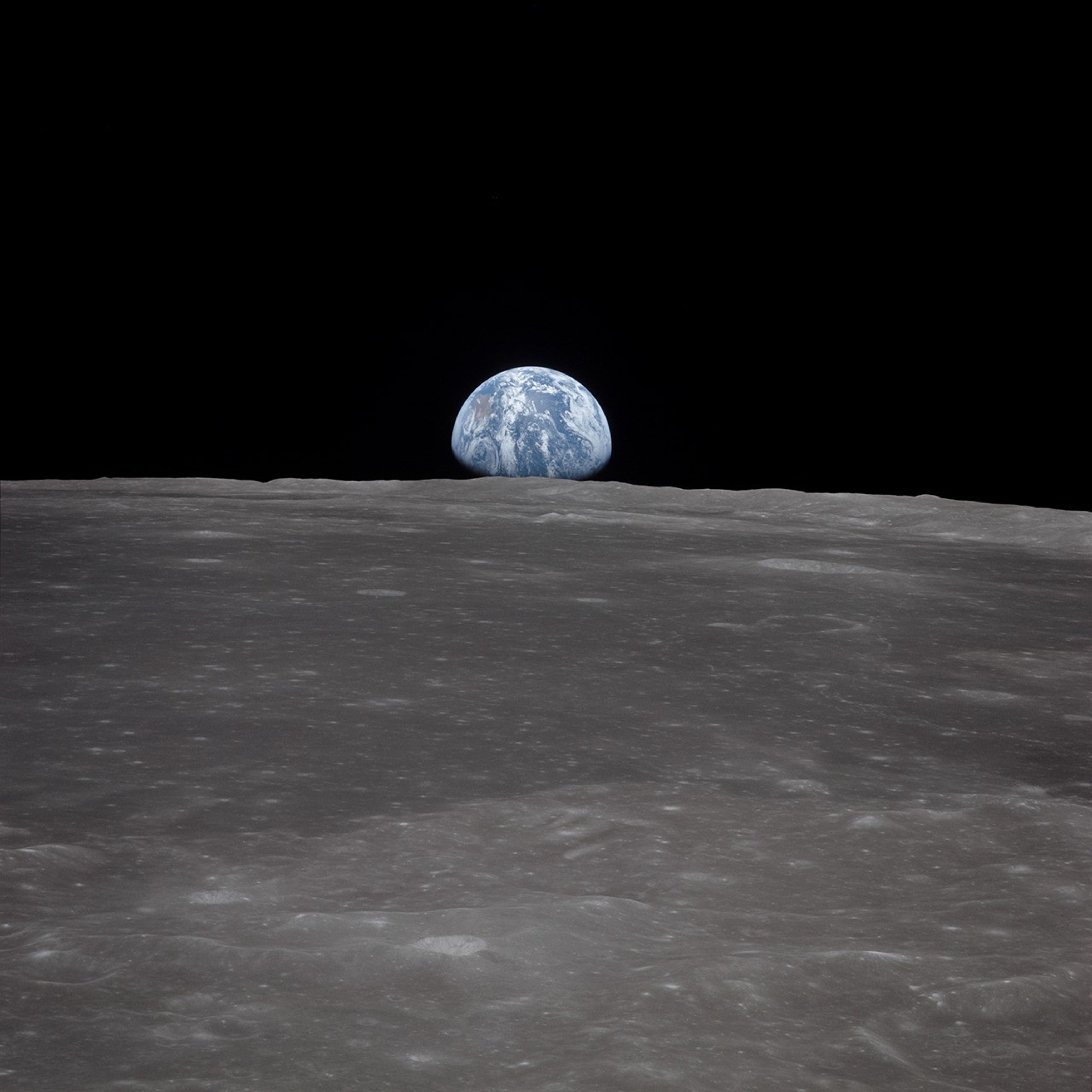 This view from the Apollo 11 spacecraft shows the Earth rising above the Moon's horizon in July 1969. The lunar terrain pictured is in the area of Smyth's Sea on the nearside. Coordinates of the center of the terrain are 85 degrees east longitude and 3 degrees north latitude.