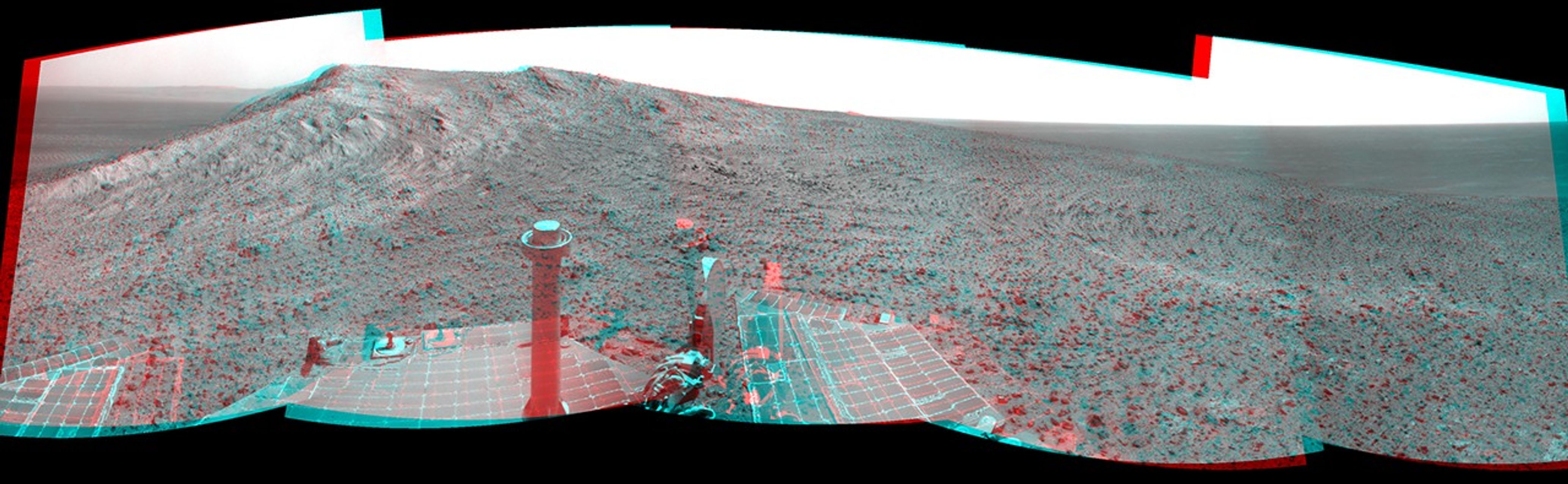 NASA's Mars Exploration Rover Opportunity recorded this stereo view of the summit of "Cape Tribulation," on the western rim of Endeavour Crater, on the day before the rover drove to the top. The scene appears three-dimensional when seen through blue-red glasses with the red lens on the left.