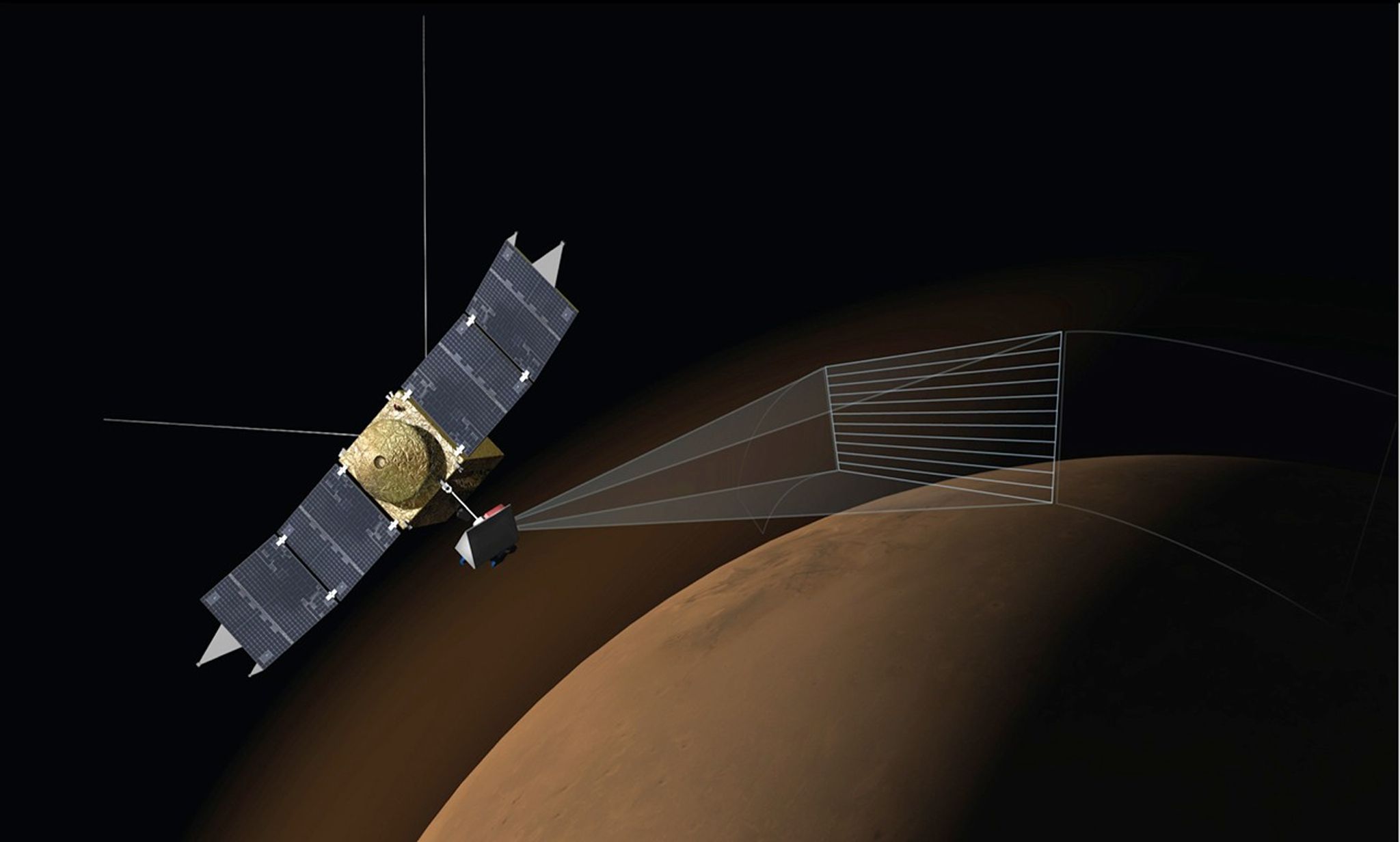 This illustration depicts the Imaging Ultraviolet Spectrograph (IUVS) on NASA's MAVEN spacecraft scanning the upper atmosphere of Mars.