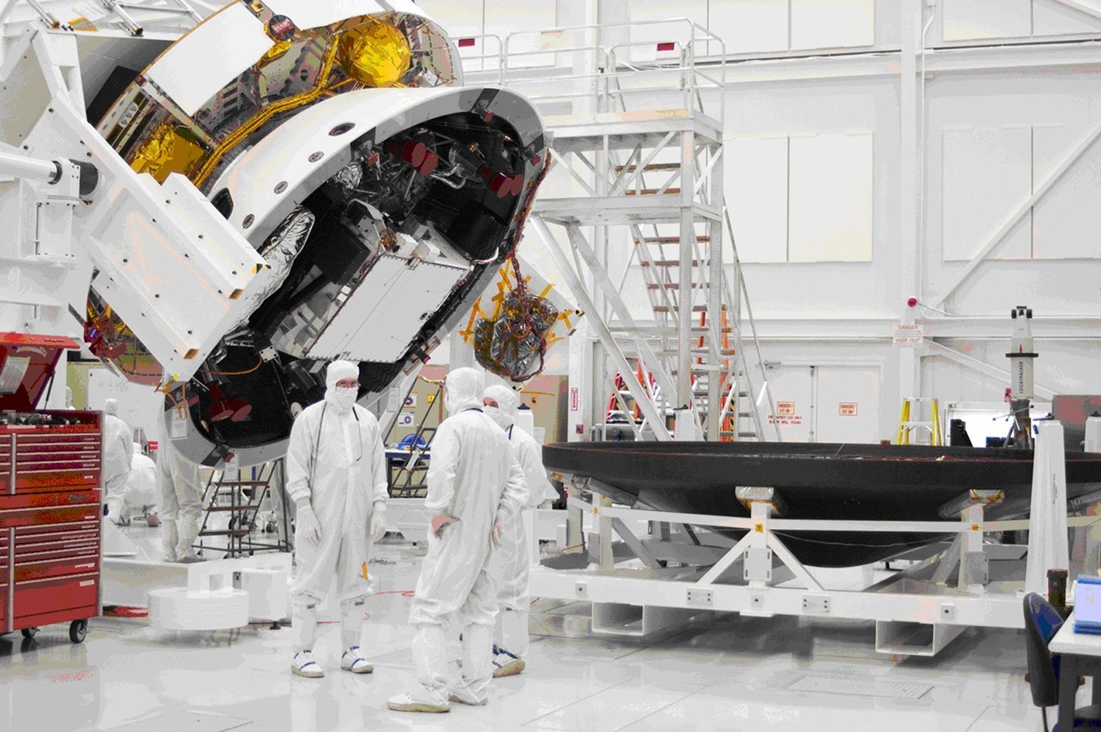 A group of engineers and technicians prepare to mate the rover (tucked inside its backshell and turned upside-down on the left) to its protective heatshield, the black disk on the right.