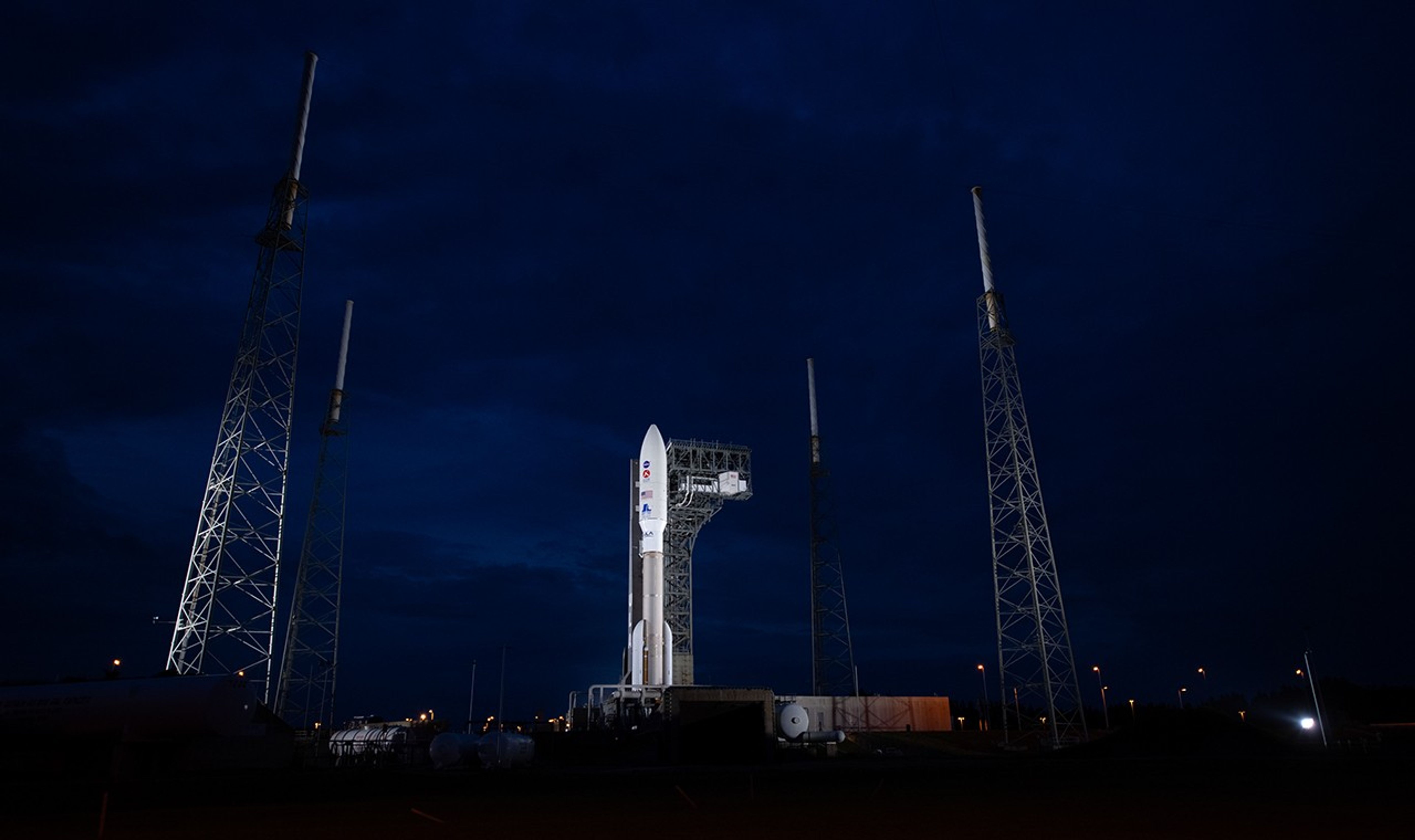 A United Launch Alliance Atlas V rocket with NASA’s Mars 2020 Perseverance rover onboard is seen illuminated by spotlights on the launch pad at Space Launch Complex 41, Tuesday, July 28, 2020, at Cape Canaveral Air Force Station in Florida. The Perseverance rover is part of NASA’s Mars Exploration Program, a long-term effort of robotic exploration of the Red Planet. Launch is scheduled for Thursday, July 30.