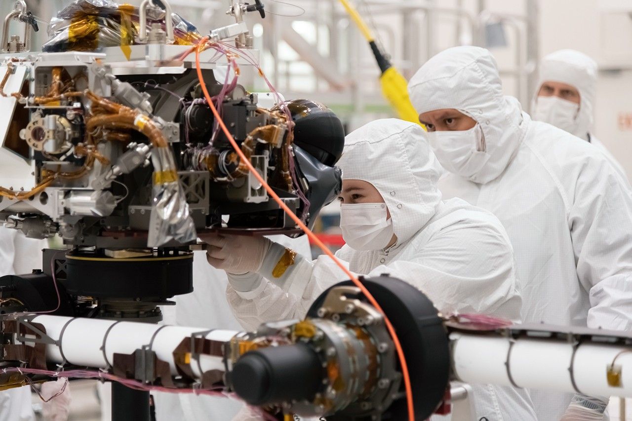 In this image taken on July 11, 2019, engineers at JPL install a sensor-filled turret on the end of the rover's 7-foot-long (2.1-meter-long) robotic arm. The turret includes HD cameras, the Scanning Habitable Environments with Raman & Luminescence for Organics & Chemicals (SHERLOC) science instrument, the Planetary Instrument for X-ray Lithochemistry (PIXL) science instrument, and a percussive drill and coring mechanism.