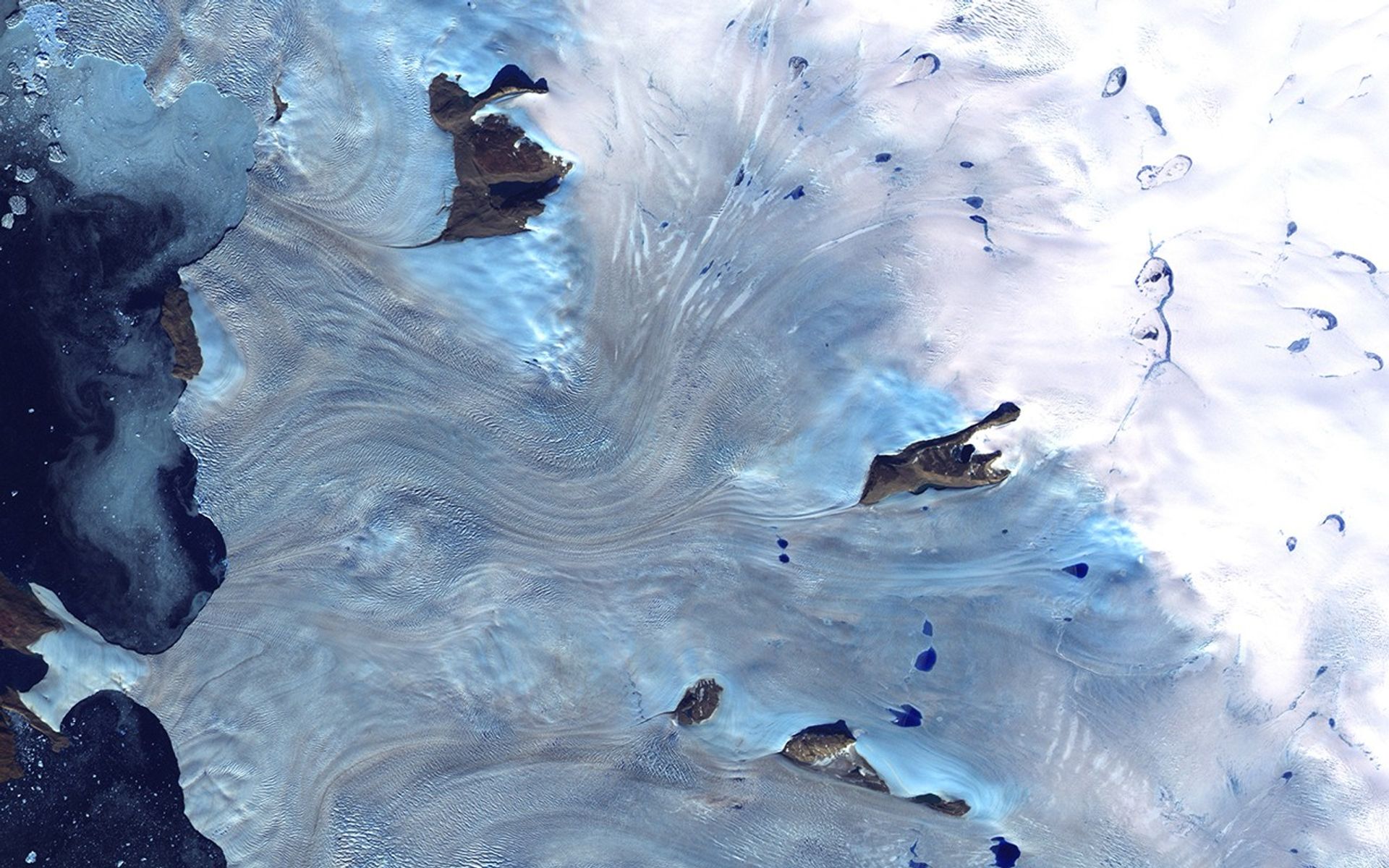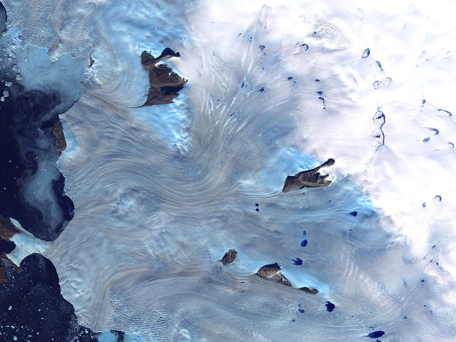 Along Greenland's western coast, a small field of glaciers surrounds Baffin Bay.