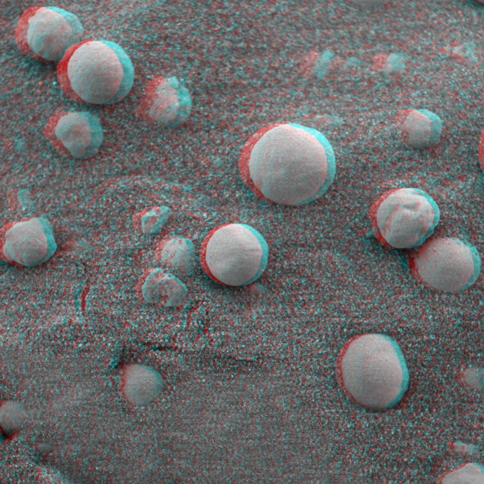 This is the 3-D anaglyph showing a microscopic image taken of soil featuring round, blueberry-shaped rock formations on the crater floor at Meridiani Planum, Mars. This image was taken on the 13th day of the Mars Exploration Rover Opportunity's journey, after the Moessbauer spectrometer, an instrument located on the rover's instrument deployment device, or "arm," was pressed down to measure the soil's iron mineralogy. Note the donut-shaped imprint of the instrument in the lower part of the image. The area in this image is approximately 3 centimeters (1.2 inches) across.
