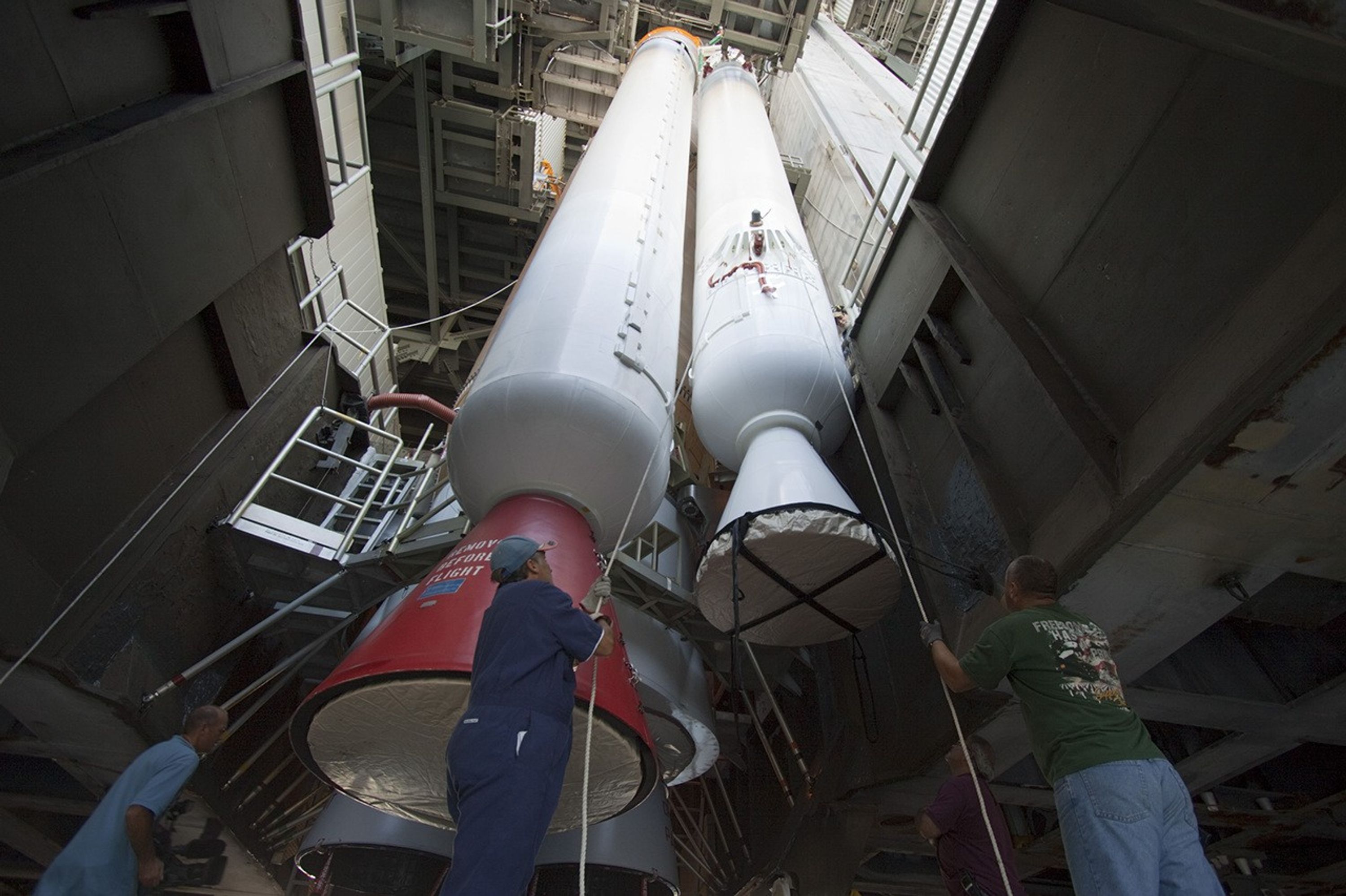 CAPE CANAVERAL, Fla. – Inside the Vertical Integration Facility at Space Launch Complex 41 on Cape Canaveral Air Force Station in Florida, technicians using an overhead crane guide the final solid rocket motor into position for mating to the first stage of a United Launch Alliance Atlas V rocket. The Atlas V will carry NASA's Mars Science Laboratory (MSL) mission into space. Curiosity has 10 science instruments to search for evidence about whether Mars has had environments favorable for microbial life, including chemical ingredients for life. MSL is scheduled to launch Nov. 25 with a window extending to Dec. 18 and arrival at Mars Aug. 2012. For more information, visit http://www.nasa.gov/msl.