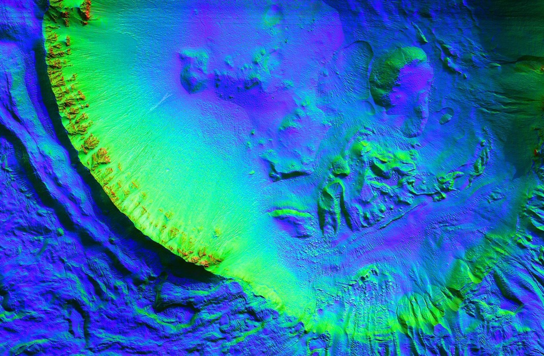This unnamed impact crater is about 8 kilometers in diameter and contains numerous gullies. A bright deposit was found to form on the lower slopes of one of them in recent time. Scientists questioned whether this was an indication of liquid water or dry materials (sand) flowing down the side of the crater. After analysis, the presence of liquid water in this flow event cannot be ruled out, but the available evidence is consistent with a dry granular flow.
