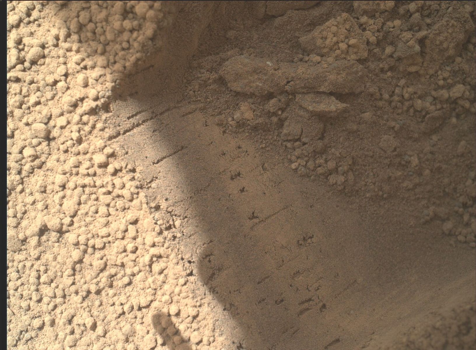 Curiosity's Mars Hand Lens Imager (MAHLI) camera took this image on the mission's 66th Martian day, or sol, (Oct. 12, 2012) showing part of the hole or bite left in the ground when Curiosity collected its first scoop of Martian soil five sols earlier. A clod of soil near the top center of the image contains a light-toned particle. The observation that the particle is embedded in the clod led scientists to assess this particle as Martian material, not something from the spacecraft. This assessment prompted the mission to continue scooping in the area, despite observations of a few light-toned particles in the area being scooped.