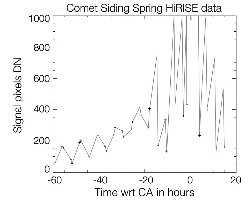 This graph shows changes in apparent brightness of comet C/2013 A1 Siding Spring as it approached and receded from Mars, as seen by the High Resolution Imaging Science Experiment (HiRISE) camera on NASA's Mars Reconnaissance Orbiter.