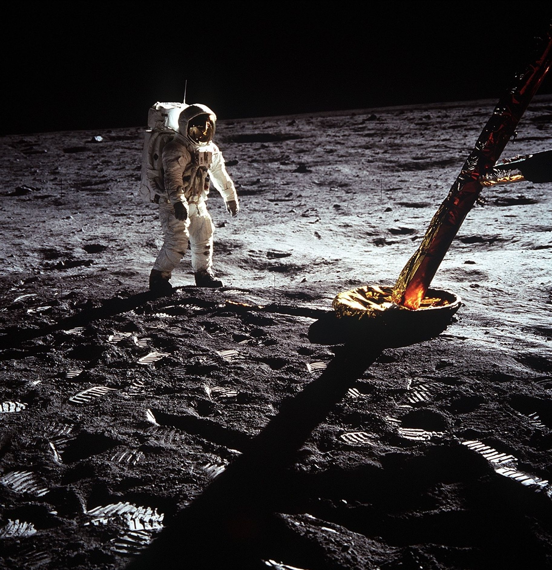 Astronaut Edwin E. "Buzz" Aldrin Jr., lunar module pilot, walks on the surface of the Moon near a leg of the Lunar Module during the Apollo 11 extravehicular activity (EVA). Astronaut Neil A. Armstrong, Apollo 11 commander, took this photograph on July 20, 1969 with a 70mm lunar surface camera. The astronauts' bootprints are clearly visible in the foreground. While astronauts Armstrong and Aldrin descended in the Lunar Module (LM) "Eagle" to explore the Sea of Tranquility region of the moon, astronaut Michael Collins, command module pilot, remained with the Command and Service Modules (CSM) "Columbia" in lunar orbit.
