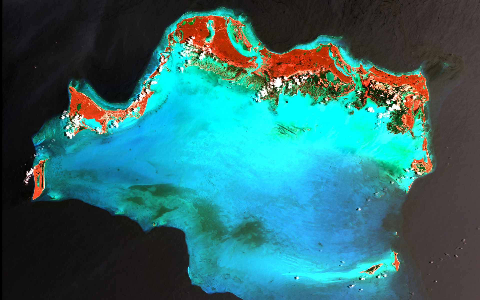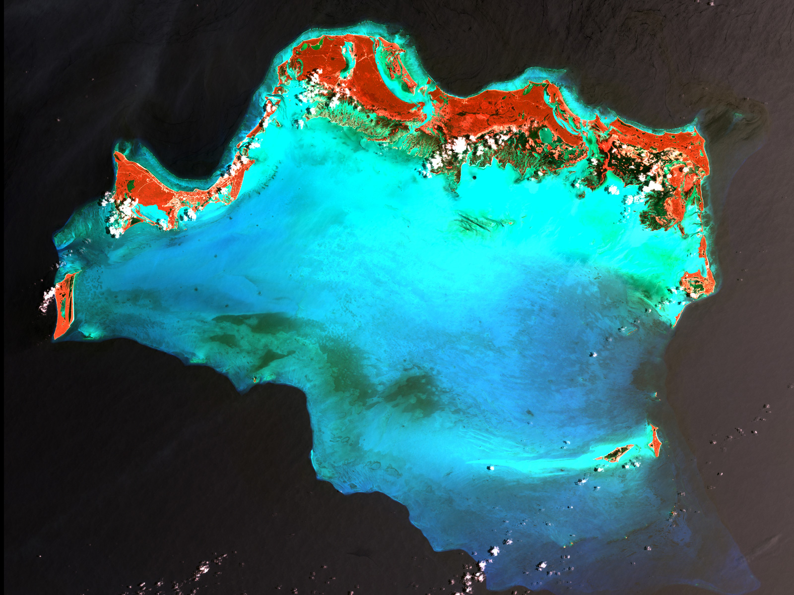The Caicos Islands in the northern Caribbean are a popular tourist attraction, renowned for their beautiful beaches, clear waters, scuba diving, and luxury resorts. The islands lie primarily along the northern perimeter of the submerged Caicos Bank (turquoise), a shallow limestone platform formed of sand, algae, and coral reefs covering 2,370 square miles (6,140 square kilometers). Image taken by Landsat 7 on April 24, 2003.