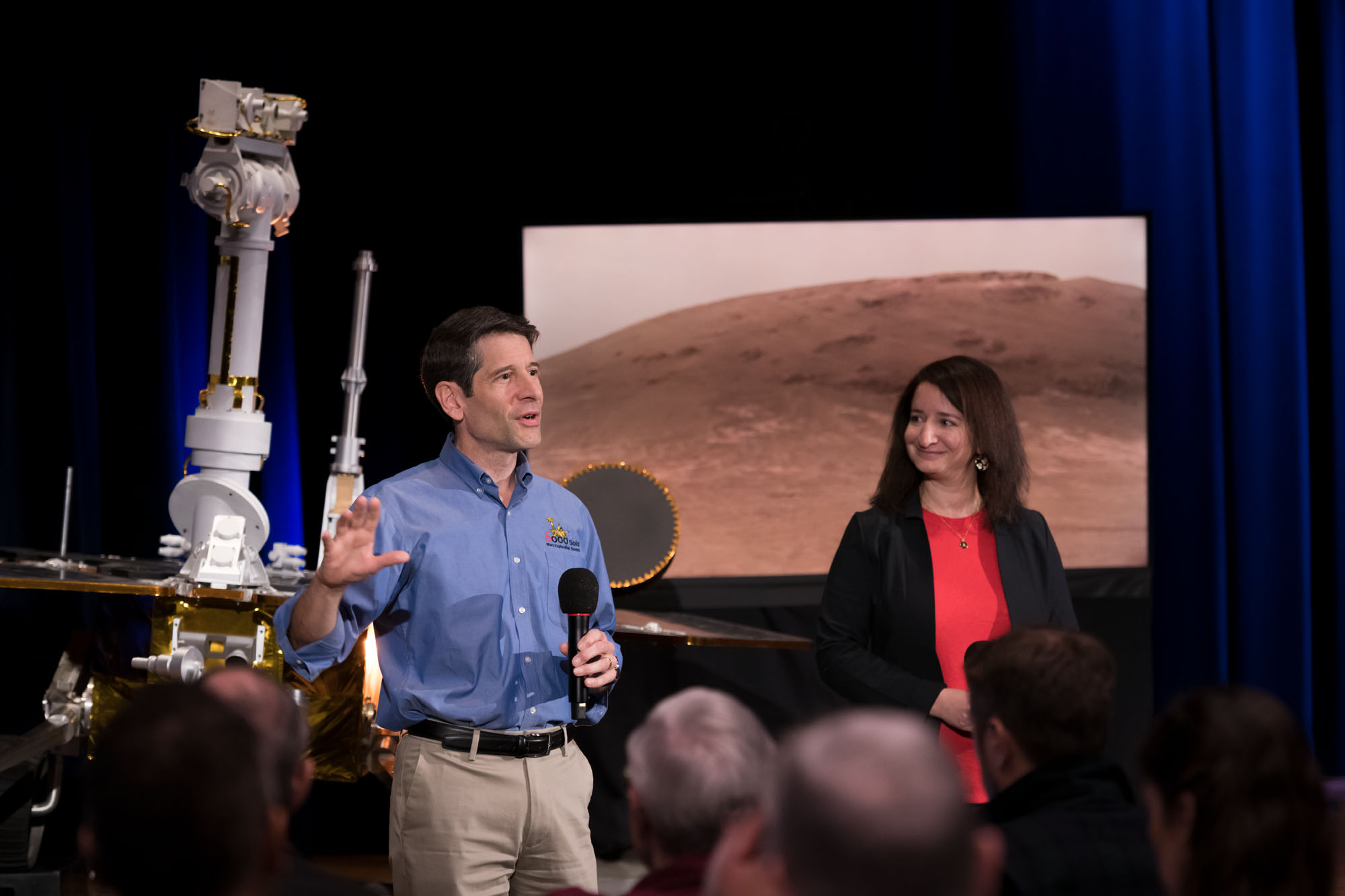 With a model of NASA's Opportunity rover behind him, John Callas, project manager of the Spirit and Opportunity Mars rovers, speaks about the rovers' achievements at the agency's Jet Propulsion Laboratory in Pasadena, California. Deputy Project Scientist Abigail Fraeman (right) looks on.