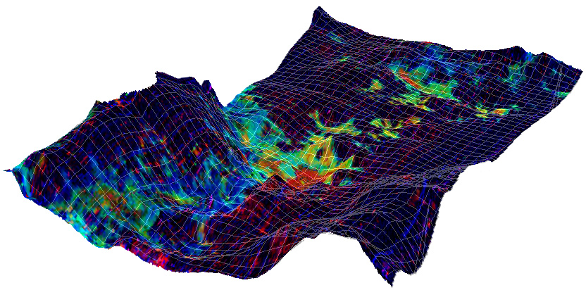 This map showing the location of some clay minerals in of a portion of the Mawrth Vallis region of Mars covers an area about 10 kilometers (6.2 mile) wide. The map is draped over a topographical model that exaggerates the vertical dimension tenfold.