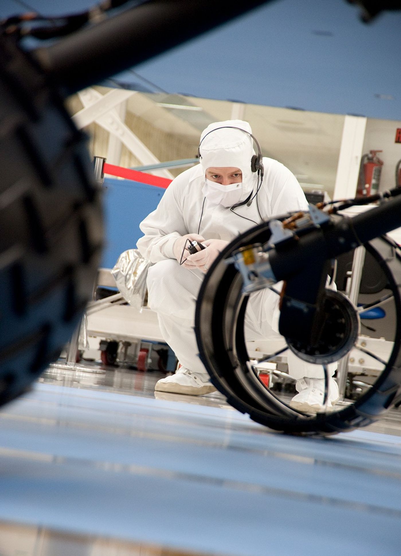 A test operator in clean-room garb observes rolling of the wheels during the first drive test of NASA's Curiosity rover, on July 23, 2010.